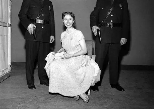 In addition to the pearl dress, Miss Connolly wears four strands of pearls valued at $250,000, a purse valued at $40,000, a bracelet at $40,000, earrings at $15,000, a pin at $10,000, a ring at $10,000, and a single solitaire pearl valued at $35,000. Those two pistols say she isn’t going anywhere with all that stuff. — Image by © Bettmann/CORBIS