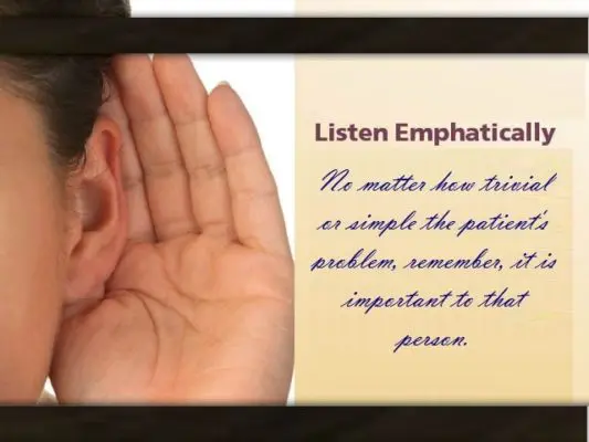 Empathic listening (also called active listening or reflective listening) is a way of listening and responding to another person that improves mutual understanding and trust. One-sided persuasion is not sustainable and is often insulting, especially to a patient who is in pain and distress.