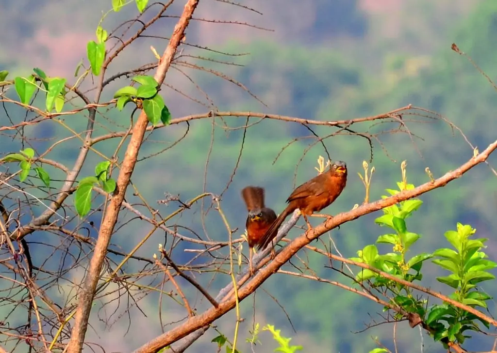 Their colors are also suggestive of their behavior; the Gray-headed Bulbul is very shy, preferring to stay in dense foliage and often being only recognized by the call which is a characteristic single note metallic “dzee”, whereas the Flame-throated Bulbul has a very melodic call and can be seen playing energetically among bushes. The easiest place to spot the Flame-throated would be in bushy flatlands on the road that leads down to Arbi Falls, after you have crossed the falls.