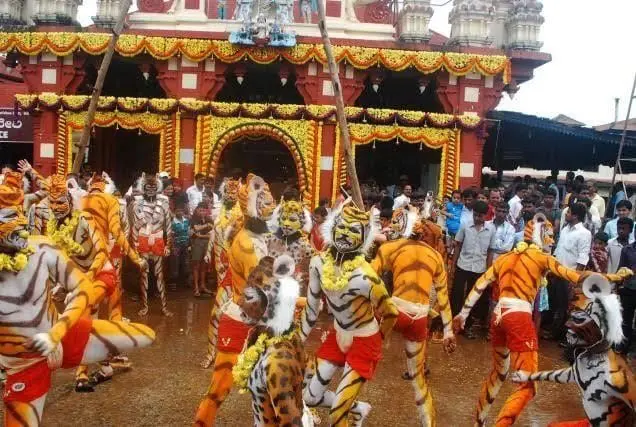 Around the festival of Dasara or the Janmashtami, you will see kids and men of all ages with their bodies painted like Tigers traveling around the city of Udupi. This Tulu Nadu art form, you would have seen in popular movies being called ‘Tiger Dance,’ just sets the beats in you. It has men who have painted themselves all over the body with leopard or cheetah motifs dancing to loud drums like crazy maniacs.