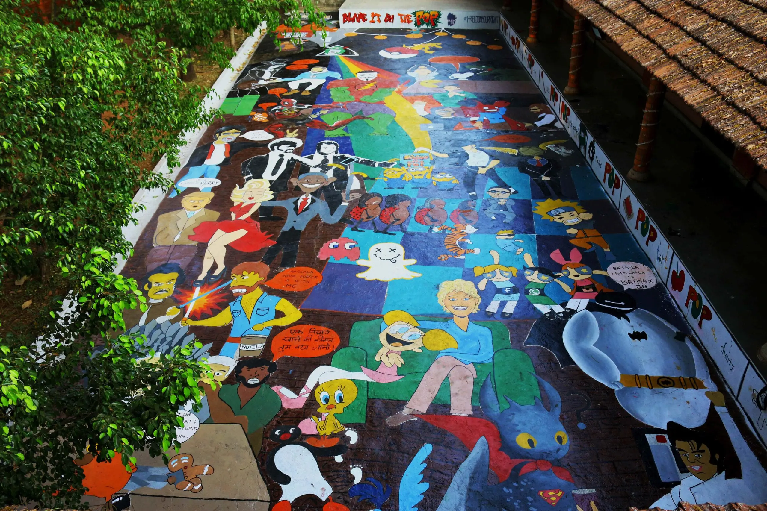 The club members of Palette of Design (POD), of School of Communication (SOC) today threw the college quadrangle open for the ‘fun fair’ organized as part of Article 19, a media fest. The quadrangle painting which largely follows the theme of the media fest – “Blame it on the pop” being this years theme as Pop culture envelops all that is in trend today looked colorful with the marvel comic character Deadpool to the adored Pokémon Pikachu. The students have created many merged characters including a blend of Baymax of the Big Hero 6 fame and the DC Comic, Batman; Hitman the professional assassin with a snitch from the game of Quidditch in the world of Harry Potter, as his head; Marlon Brando, playing the role of Godfather, the trilogy based on the work of Mario Puzo -seated on the Iron throne of the popular books and TV show, Game of Thrones; the Beatle band members with bodies of real beetles and many more. The creative bunch of students have portrayed these pop icons with their own creative additions. The quadrangle embodies the theme laying emphasis on the raving popular culture in the fields of music, the film industry, cartoons, and many more