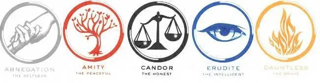 It is set in a dystopia where people are sorted into one of five factions based on their personality traits. The five factions are based on personality, virtue, and strength. Each group possesses certain qualities they mutually value and excel at. The factions are called Abnegation (selfless), Erudite (intellectual), Dauntless (brave), Candor (honest), and Amity (peaceful).