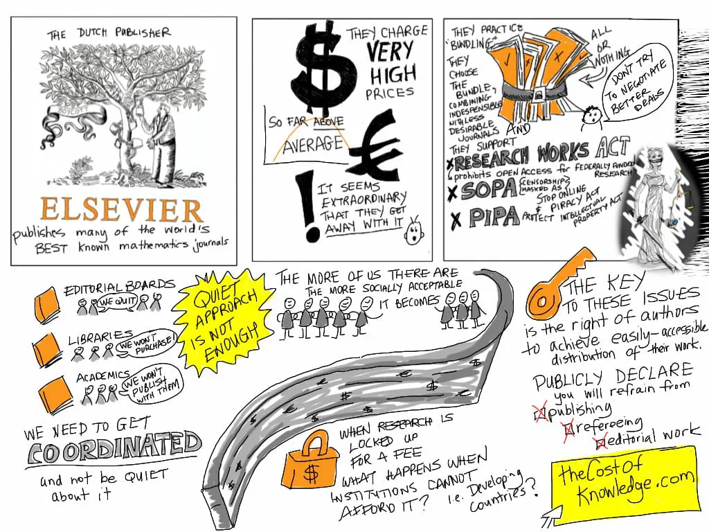This doodle sums up the Cost of Knowledge for publsihing and subscibing to academic journals with a high citation index.Image Source: The ?Cost of Knowledge? ? On the Elsevier boycott and the push for more open access