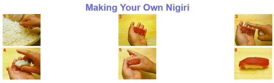 Nigiri sushi is a slice of fish (cooked or uncooked) pressed by hand onto a pad of rice. Fish roe is also served as nigiri sushi in a style called gunkan, meaning “boat”. Nigiri sushi contains a hint of horseradish and is meant to be dipped in soy sauce. They are always served in pairs.