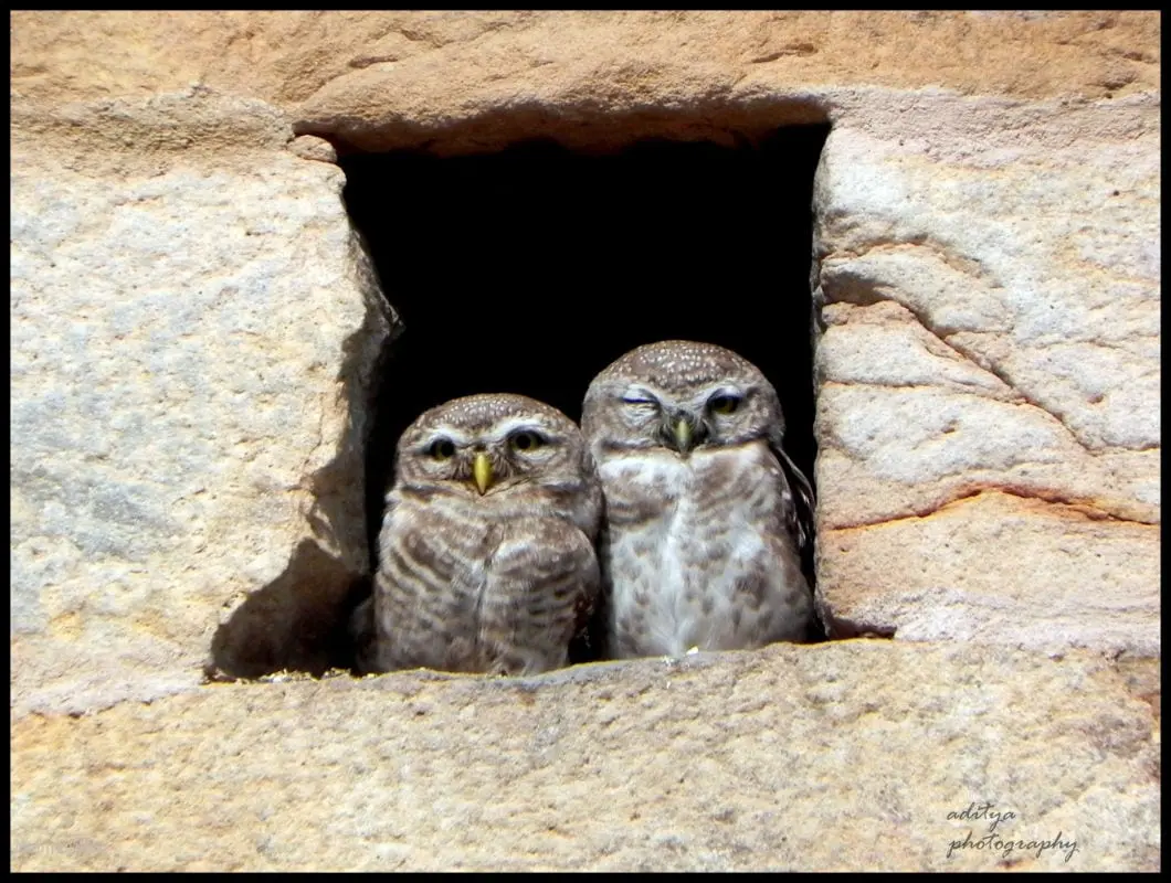 So, the winner of the Photo of the Week for 24.7.2012 is Aditya Sinha, an M.Tech (Software Engineering) student of Manipal Institute of Technology (MIT), Manipal University, Manipal. He sent us a very neat picture of a couple of Owlets close together peeping from a recess in a granite wall!