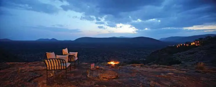 With only the sound of insects in the grass to disturb you, sit back and admire the dramatic cloud formations as the sun dips behind the horizon. Promising to revive your mind, rejuvenate your body and revitalise your soul, Loisaba also offers small log fires on clifftops with sweeping views across the African plains (below). Similar landscapes – albeit in a more spectacular setting – can be seen from Tortilis Camp’s cafe and lounge area.