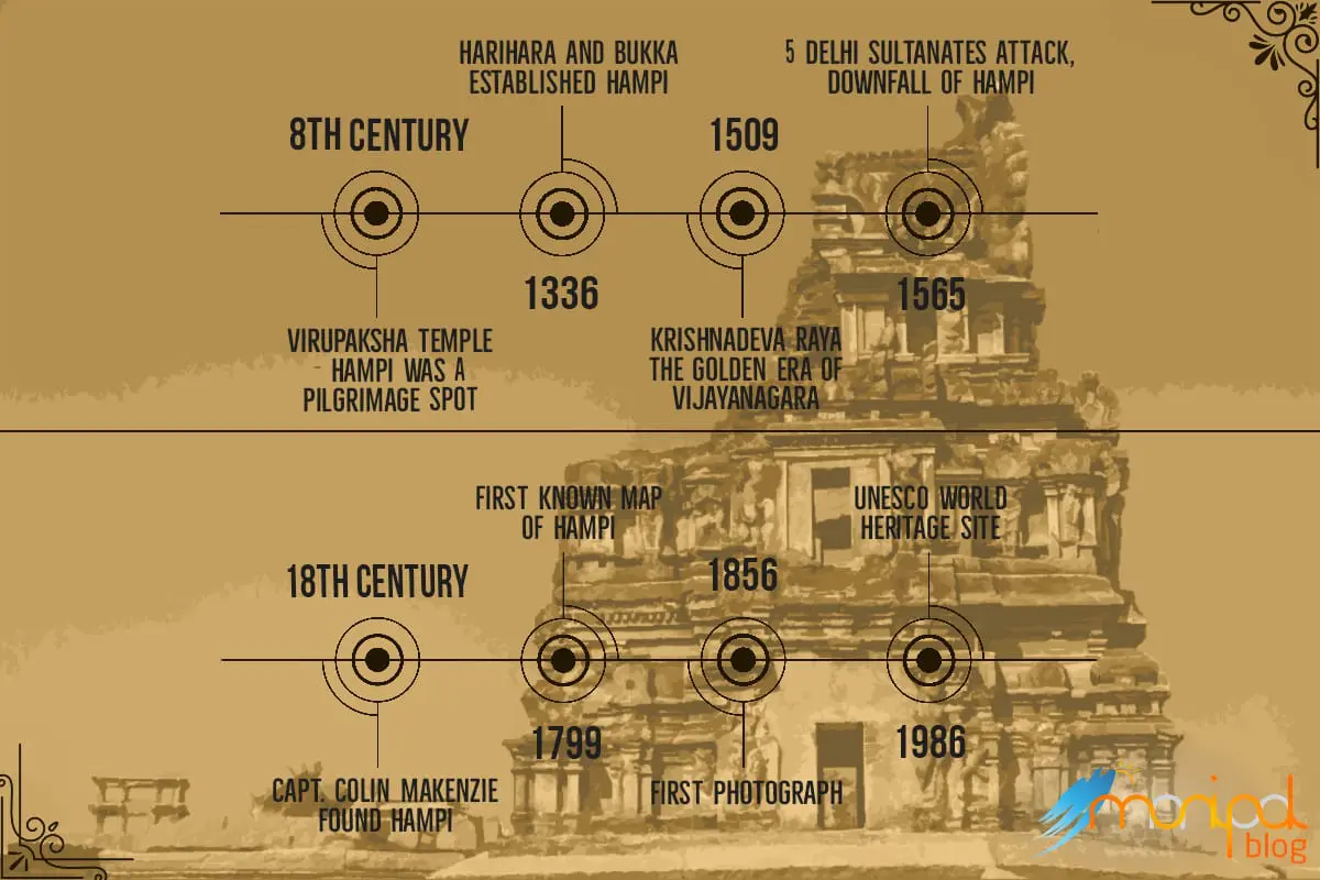 Hampi is a small city located in Karnataka. The history of Hampi dates back to the prehistoric Neolithic age, and mythical mentions of Shiva Purana. Although different in their names, Shiva Purana referred to the name of the city as ‘Pampa Kshetra’ in the ‘Krutayug’ and ‘Kishkinda’ the kingdom of Vali & Sugreeva in the ‘Treta Yuga’. However, the modern name Hampi originated from the mythological name of Pampashetra, as the years passed, the name evolved from Pampashetra to Hampi due to language restrictions and the difference in pronunciations.