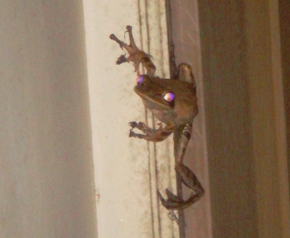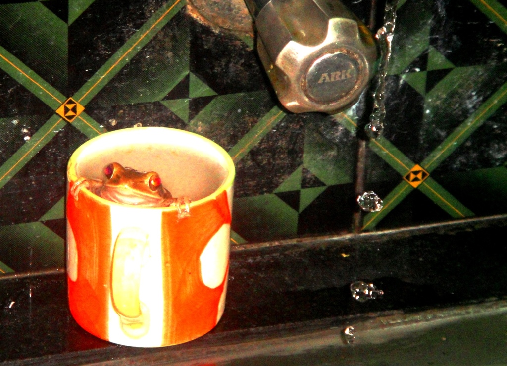 Who says frogs are going to extinct, certainly not here. We have stopped doing animal experiments using frog because of serious questions raised by animal activists. But the frog we use for experiments are large and docile. But these jumping frogs are active, always in attacking position as if are on war, their alien eyes,  slimy body and what not. One day I entered the kitchen, I could see a frog hidden in bunkers i.e. my tea cups. The house where I live I think it belongs to these frogs as good as it  belongs to me. The war is on.