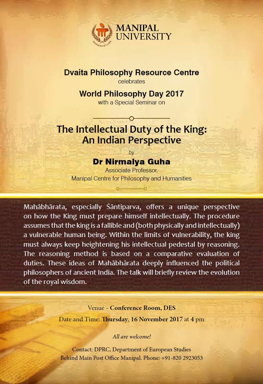 Dvaita Philosophy Resource Centre (DPRC) is set celebrate the World Philosophy Day 2017 with a Special Seminar on Thursday, 16 November 2017 at 4 pm at the Department of European Studies by Dr. Nirmalya Guha. He is scheduled to speak on The Intellectual Duties of the King: An Indian Perspective.