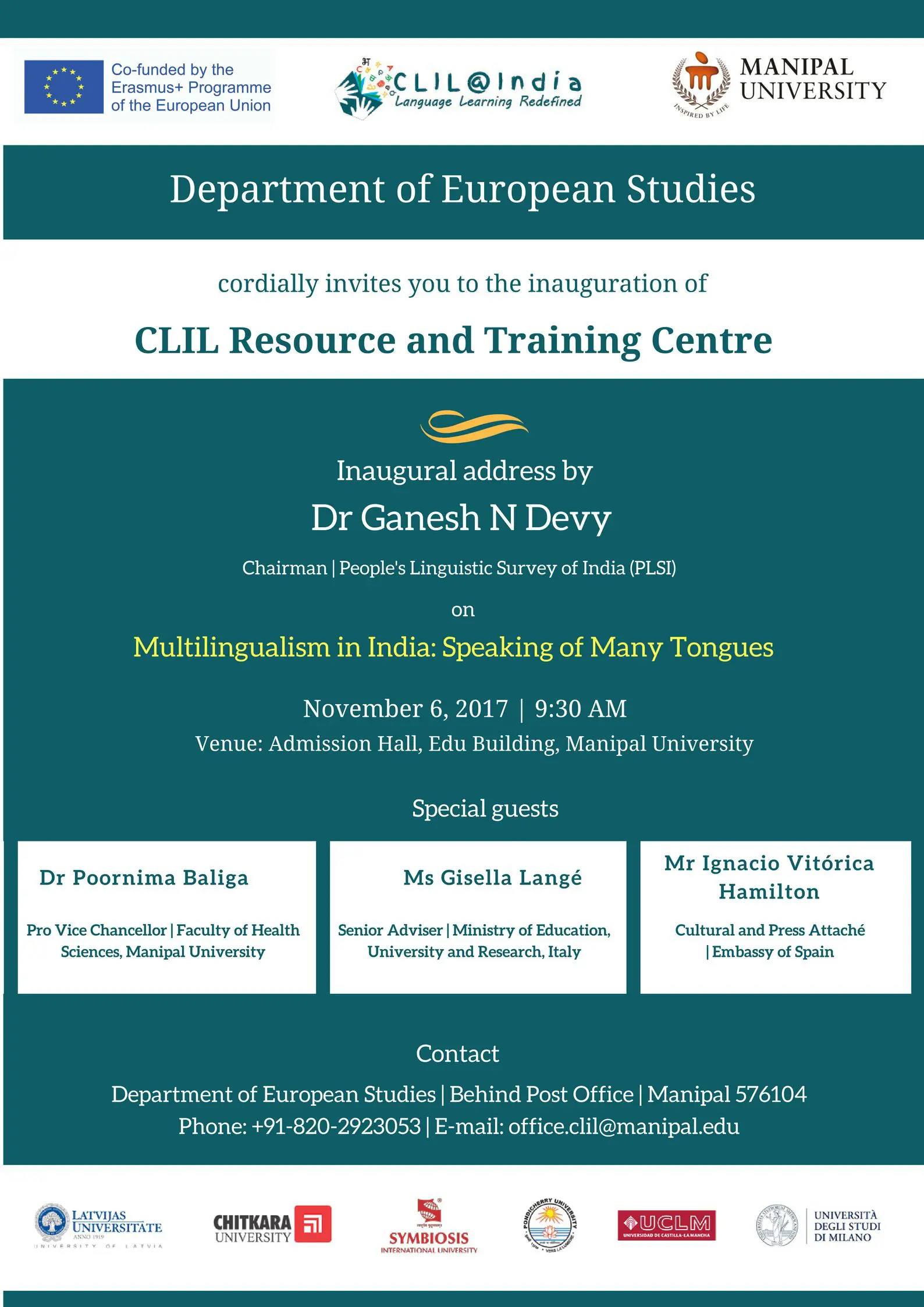 The CLIL@India project, led by Manipal University, will inaugurate its Content and Language Integrated Learning (CLIL) Resource and Training Centre on 6 November at 10 AM at the Admission Hall of the Edu Building. Renowned linguist, activist, and Chairman of the People’s Linguistic Survey of India (PLSI) Dr. Ganesh N Devy will deliver the inaugural address titled ‘Multilingualism in India: Speaking of Many Tongues’.