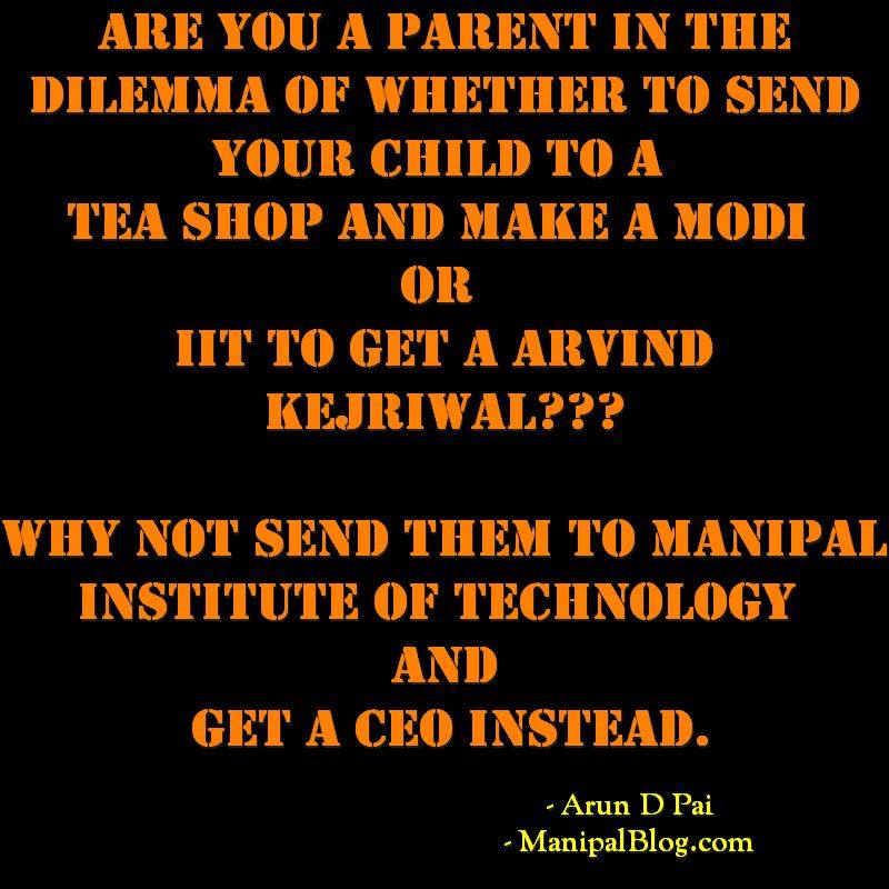 “Are you a Parent in a dilemma of whether to send your child to a TEA SHOP and make a MODI or IIT to get a Arvind Kejriwal??? Why not send them to Manipal Institute of Technology and get a CEO instead?”