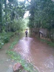 Now there are three to four types of regions(?) We have to cross to reach home. First of all, the 3 – 4 red rocky narrow lanes, 2-3 inches of muddy water, gushing from this end to the other! So, to save the slippers, I took the slippers and the handbag in one hand and the saree (a bit above the ankles) and the open umbrella in the other hand and walked through these lanes – felt like a three-ring circus! I do not believe the present generation can even imagine this rope trick!. The lanes were just a few yards each, but looked like a mile. Then you have to cross a couple of paddy fields flooded and buried in muddy water, with tips of green grass peeping through – you walk on a plain strip of land between two such large rice fields. Crossing the fields is an adventure by itself.