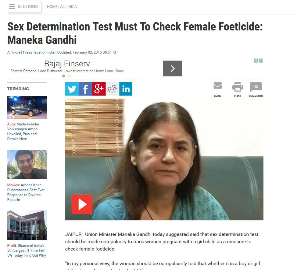 Ms. Maneka Gandhi, Union Minister for Women & Child Development in the Government of India as of today, has come up with a completely different opinion on how to prevent female feticide in this country. Brilliant brainwaves as she gets always, this idea is as awesome as the disclaimer she made movie-makers put on the screen – This was shot outside India ( because shooting in India is torturing for the animals, if shot in Switzerland Its a blast for them).