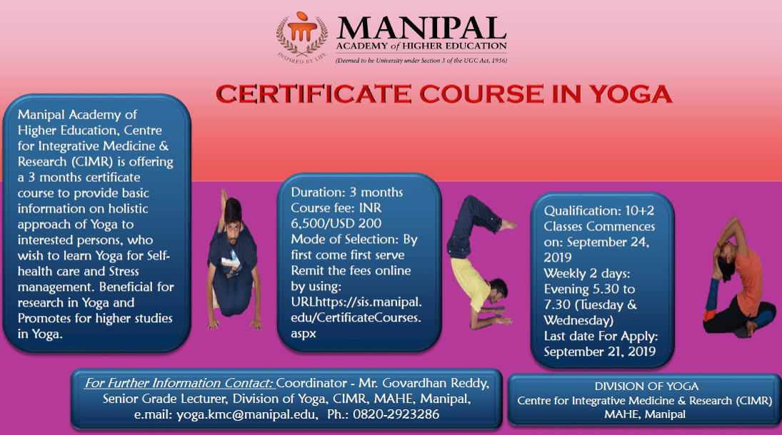 Manipal University is a reputed university that will offer you a variety of courses. The yoga course delivered by the university is a recognized course, and the certification that you will get after the completion of the course is of the highest value. Not only that, the MSc in Yoga Therapy, offered by the Division of Yoga, Centre for Integrative Medicine and Research at Manipal university has the best faculty and instructors who will teach you all the things about yoga that will further help you in creating your future.