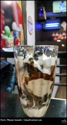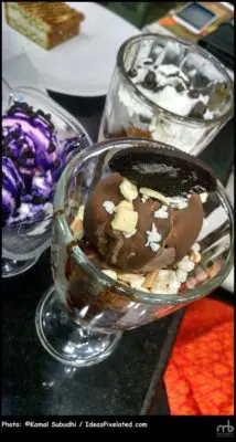 Choc-A-Block: The perfect combination of vanilla and chocolate ice cream, topped off with chocolate sauce, cashew nuts, cookie crumbles. The creamy smoothness leaves you craving for more.
