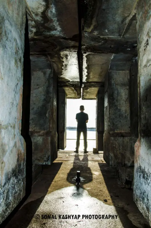 This column was dark and using flash was not an option as it would have left harsh shadows and retaining natural colors would have been tricky. You can see there is an external flash lying in the center but the results were not good. It’s always learning by experimenting in photography. I took a handheld burst of 3 shots at underexposed, normal and overexposed. I later used simple HDR processing software like Photomatix pro and it automatically did the job for me by bringing fine details. Also I asked my friend to stand in frame to create a ‘subject of interest’. Luckily the shadow was straight and complemented the mood of photograph.
