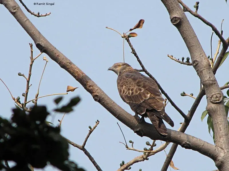 A funny looking bird, which has a typical pigeon like head and massive, rounded wings that is famous for it’s uncanny diet – honey! Although it hunts very rarely, you can often see it soaring on sunny afternoons. It has a head that exposes no flesh to help it protect from bees and slit like nostrils so that none of the angry residents of the honeycombs it raids enter its body. You can see these features in this photo really well: http://www.indianaturewatch.net/images/album/photo/1122516225483656945b304.jpg