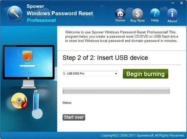 Step 4: Now, connect your media device (USB/CD/DVD) to the computer and click on the “Begin burning” option. It will take a couple of minutes for the burning process to get completed; you will get notified on completion.