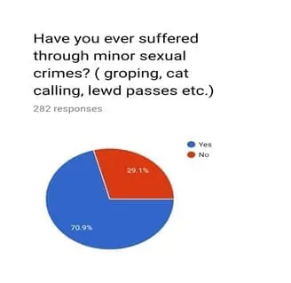 Sexual harassment is rampant across the country in various forms. 70.9% of the participants claimed to have been sexually assaulted in some form. The incidents varied from grievous forms of sexual assault such as physical abuse to catcalling and verbal pauses.