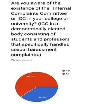 While 53.8% of females claimed to know about the constitutional provisions regarding sexual harassment mandated by the government, only 38.5% were aware of the presence of the Internal Complaints Committee in their college. Out of the 107 participants who had suffered sexual abuse on campus, only 6.7% of them had ever filed a complaint. The statistics indicate a chasm between government laws and their proper execution at the college level.