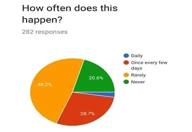 28.7% reported having been subjected to sexual harassment once every few days. Another 3.4 % claimed that it occurred every day. Even if it occurred rarely, it did in a way that left them with very slim chances to tell the respective authority about it.
