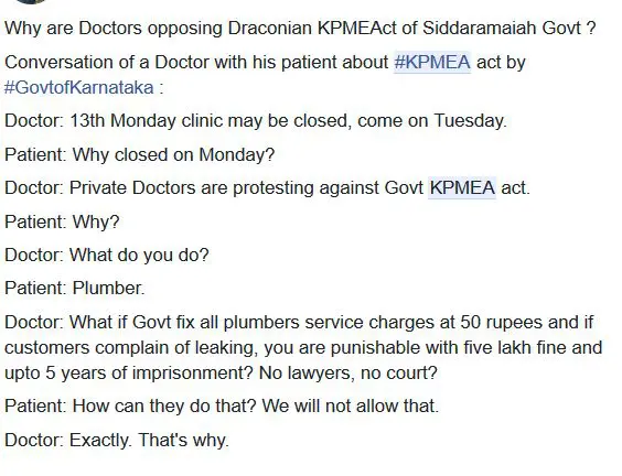 The government of Karnataka is about to implement the KPME act to control the doctors in the state, in the upcoming assembly session. It’s all handiwork of the health minister Mr. Ramesh, who has a personal grudge against all doctors in the state.