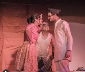 The play started amazingly with the excellent involvement of the audience. There was equal space occupied by the actors on-stage and off-stage along with the audience. The play is about a middle-aged man, a veteran tailor named Raja Master and his right hand Dilenada who aspire to open a ‘dirama’ company. The protagonist of the play is a sarcastic, short-tempered and an angry director who is frustrated with his actors and his assistant Dilenada for working abruptly. The dialogues of both the main characters make you laugh throughout the play. The director, Raja master is angry with his actors for their poor acting skills and taunts them throughout the play with his witty and savage dialogues.