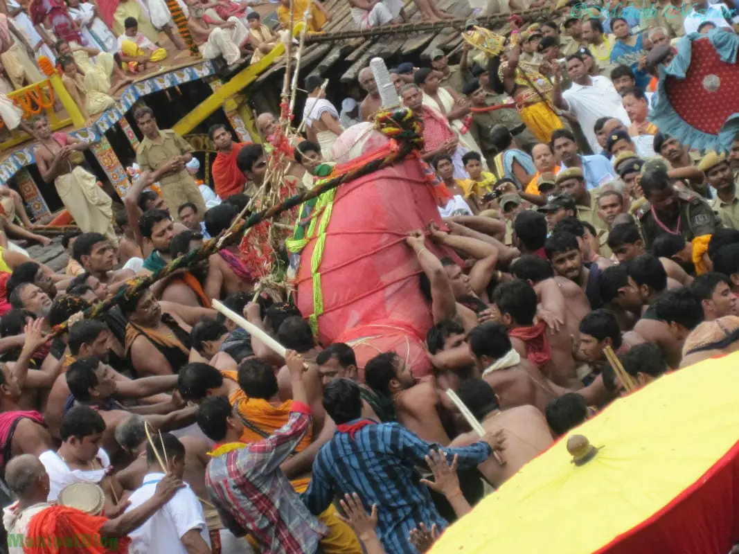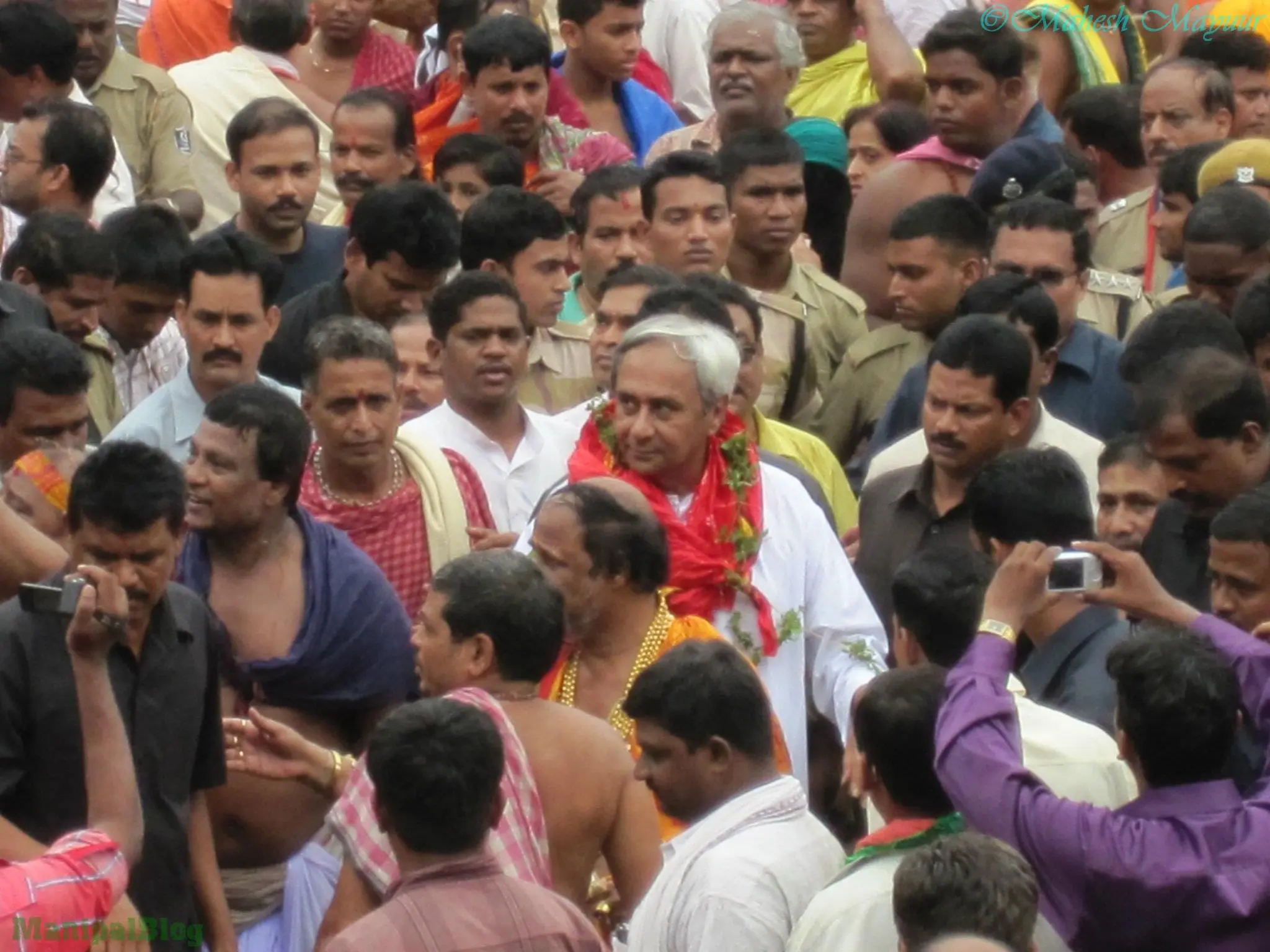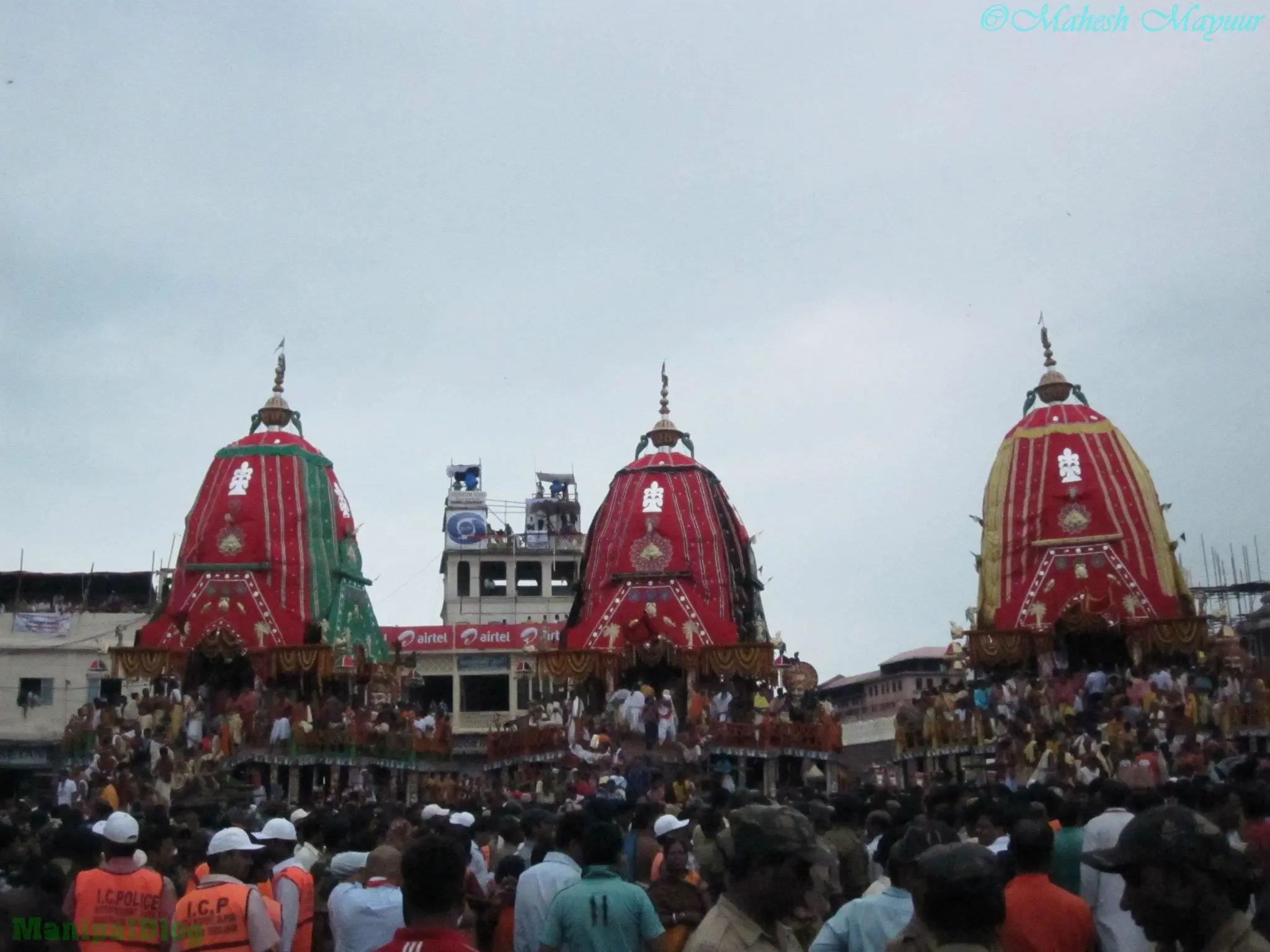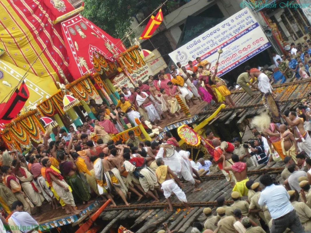 The Chief Minister of Odisha, Mr. Navin Patnaik, made a visit to the festivities and pray to the presiding deities of Puri. The festival is also known as Gundicha Jatra, Ghosa Jatra, Navadina Jatra, Dasavatara Jatra and by a variety of other names.Also every 12 years the Idols are also changed and new idols are built from wood cut from special trees. The new idols are also in the same incomplete form. This ceremony of changing idols is called Naba Kalebara.After the idols are placed on their respective chariots, there is a riutal sweeping of chariots which is performed by the descendant of the Gajapati Kings of Puri.A sea of colour as the Puri Jagannath Rath yatra begins! Each chariot is tied with 4 robust ropes made of coconut fibres. One by one the chariots are pulled by the lakhs of men and women who come to Puri Jagannath to participate in the Rath Yatra.It is believed that volunteering to pull the chariot of Lord Jagannath washes away all our sins and liberates us from the cycle of birth and rebirth.Then scented water is sprinkled all over the chariots. Then starts the day long Rath Yatra of Puri Jagannath. In the Pic: The back of the chariots are equally well decorated!First comes the charitot of Lord Balabhadra which is known as Taladhwaja followed by the chariot of Devi Subhadra known as Darpadalana and finally the chariot of Lord Jagannath, the magnificent Nandighosa.