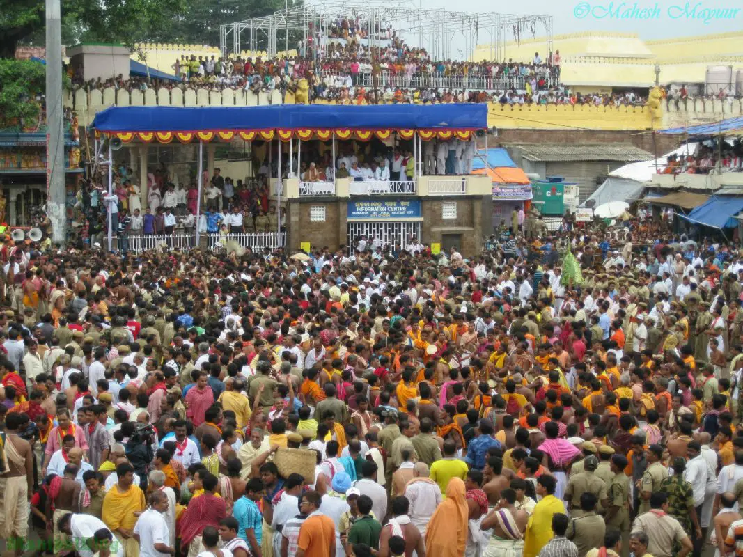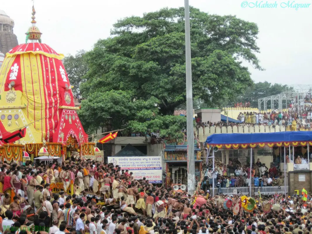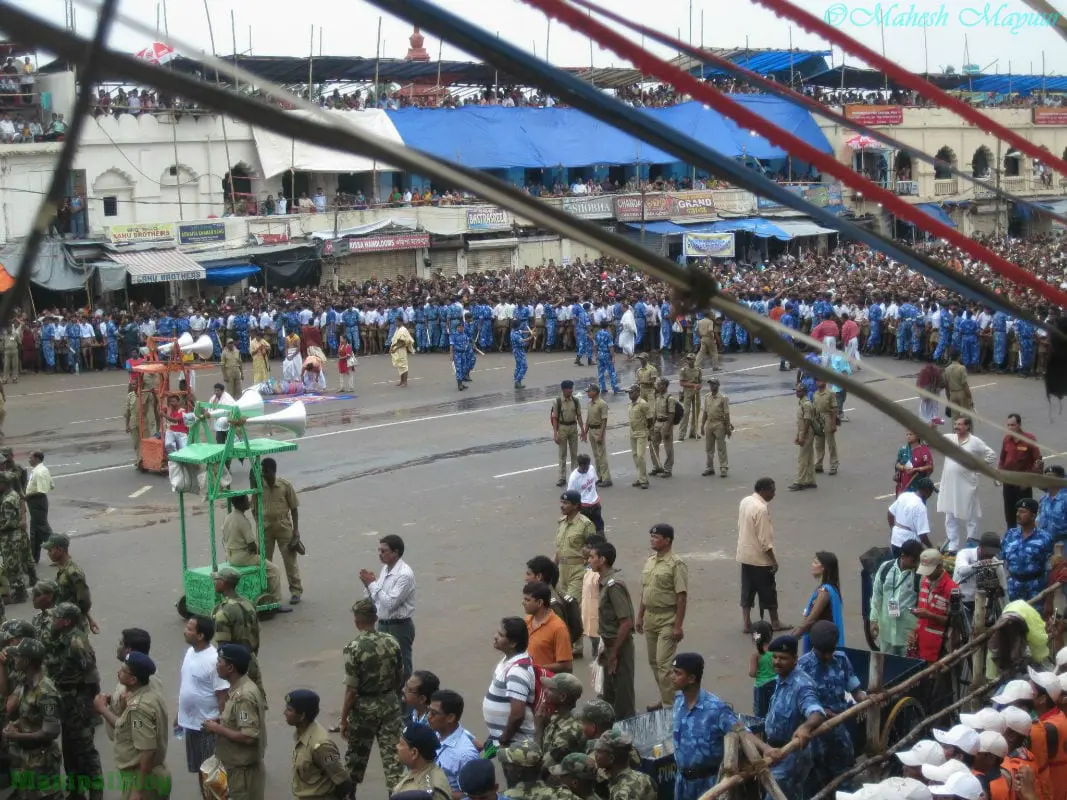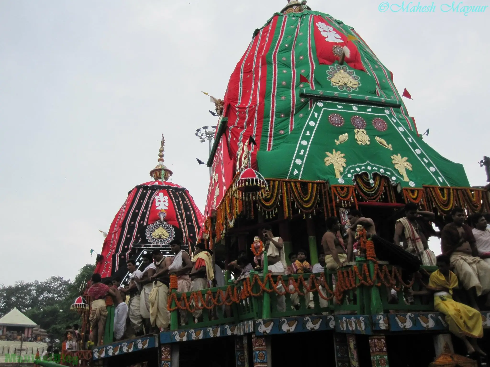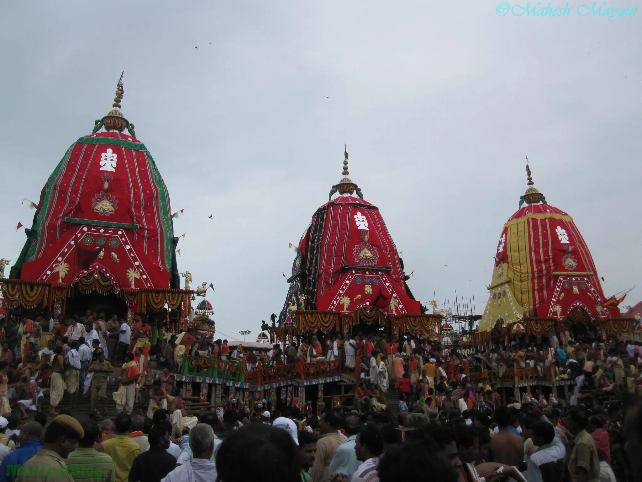 The Chief Minister of Odisha, Mr. Navin Patnaik, made a visit to the festivities and pray to the presiding deities of Puri. The festival is also known as Gundicha Jatra, Ghosa Jatra, Navadina Jatra, Dasavatara Jatra and by a variety of other names.Also every 12 years the Idols are also changed and new idols are built from wood cut from special trees. The new idols are also in the same incomplete form. This ceremony of changing idols is called Naba Kalebara.After the idols are placed on their respective chariots, there is a riutal sweeping of chariots which is performed by the descendant of the Gajapati Kings of Puri.A sea of colour as the Puri Jagannath Rath yatra begins! Each chariot is tied with 4 robust ropes made of coconut fibres. One by one the chariots are pulled by the lakhs of men and women who come to Puri Jagannath to participate in the Rath Yatra.It is believed that volunteering to pull the chariot of Lord Jagannath washes away all our sins and liberates us from the cycle of birth and rebirth.Then scented water is sprinkled all over the chariots. Then starts the day long Rath Yatra of Puri Jagannath. In the Pic: The back of the chariots are equally well decorated!First comes the charitot of Lord Balabhadra which is known as Taladhwaja followed by the chariot of Devi Subhadra known as Darpadalana and finally the chariot of Lord Jagannath, the magnificent Nandighosa.
