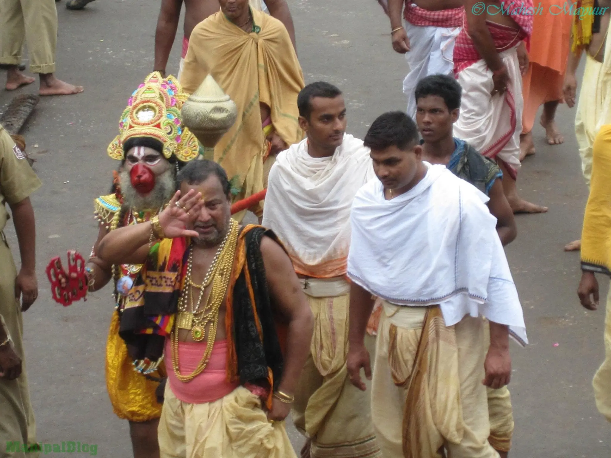 The Monkey God being escorted by the main pujari of lord Jagannath.(So do you think he can beat baapi da??? 😉 ) ! Every year the chariots are newly built for the Rath Yatra. The massive task of building the chariots is completed within a span of just 58 days starting from the day of Akshaya Tritiya which occurs in the month of April-May.
