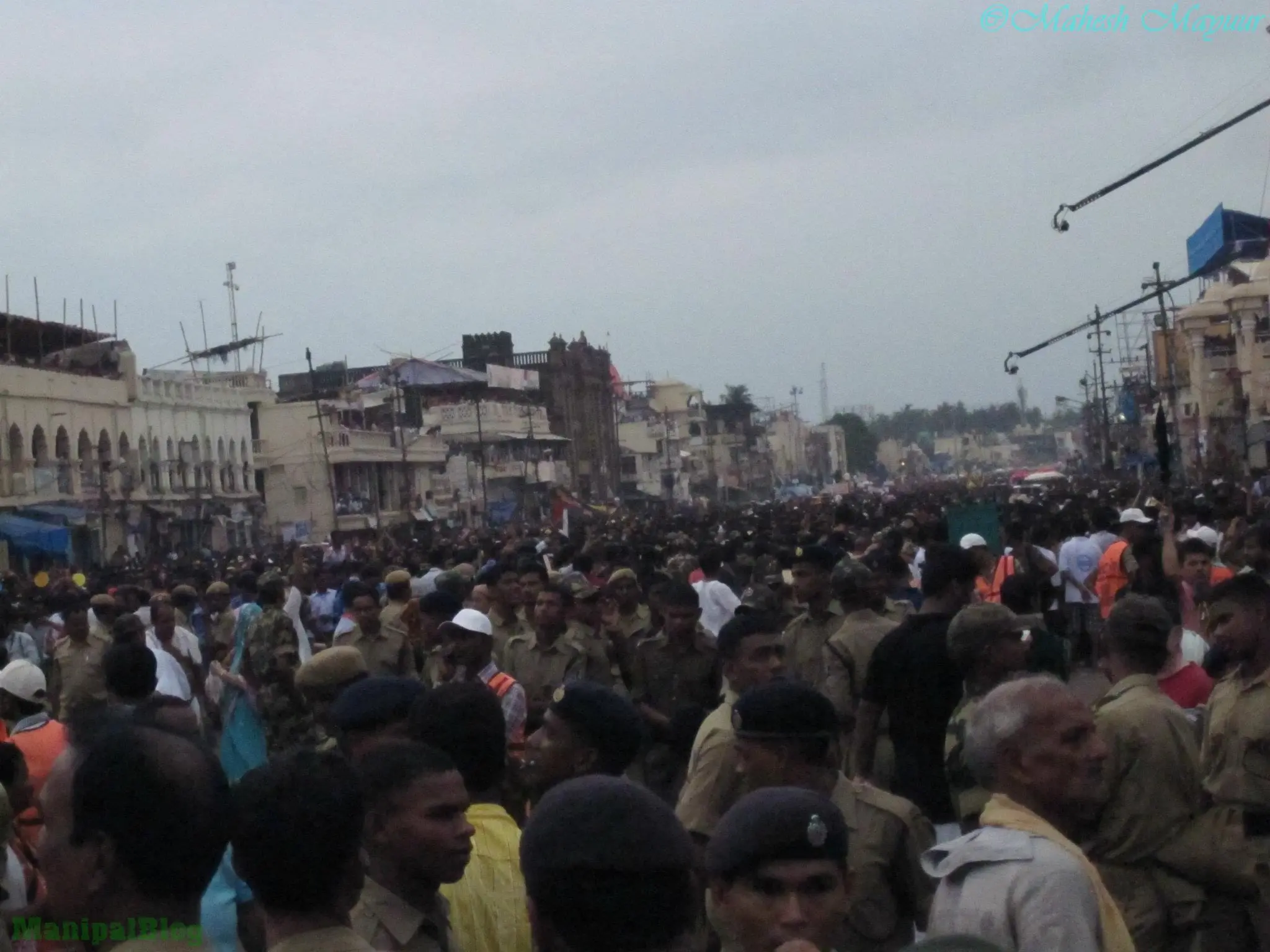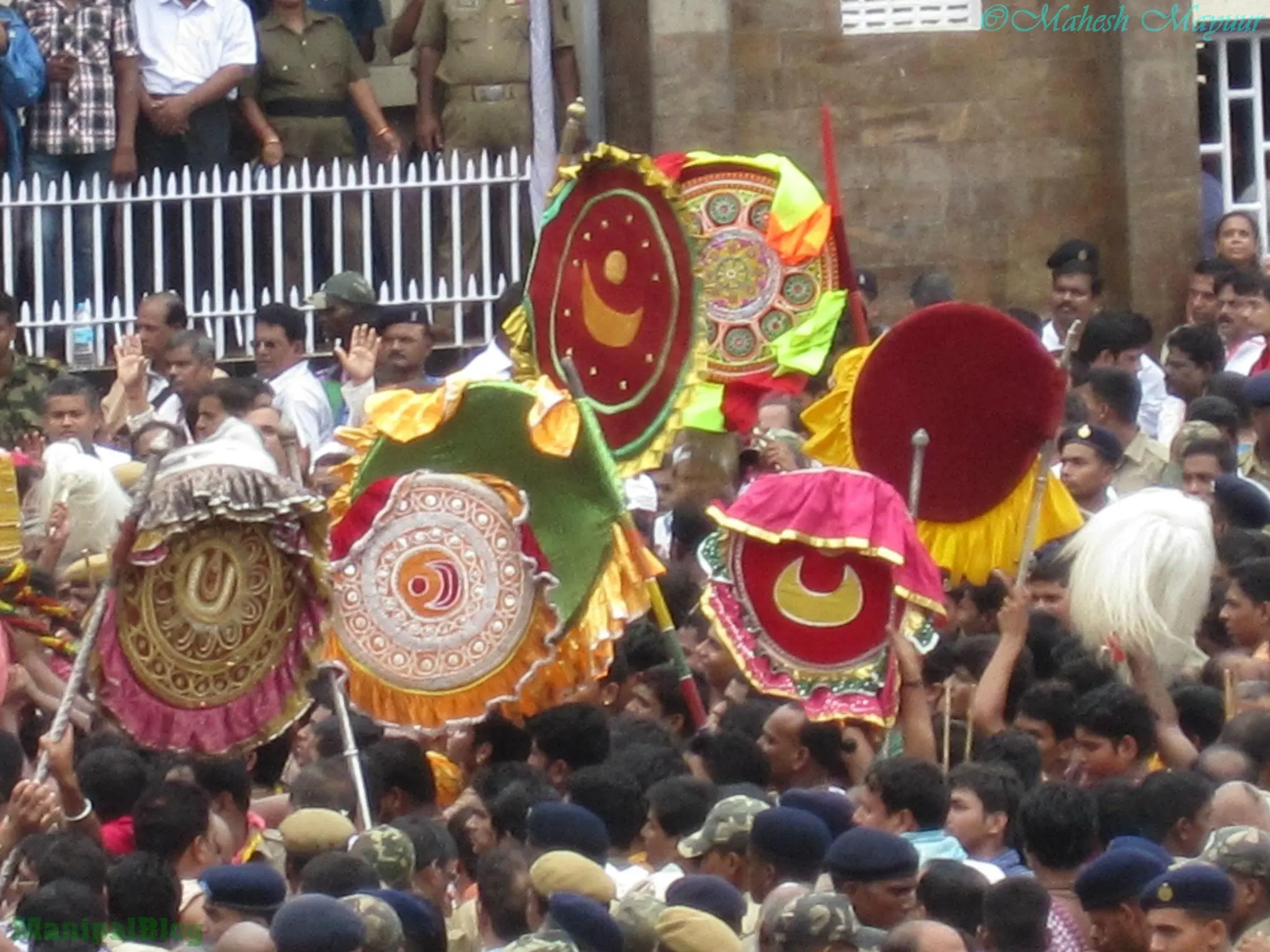 On the day of the Rath Yatra of Puri Jagannath, the beautifully decorated idols of Lord Jagannath, Lord Balabhadra, Devi Subhadra and Sudarshana are carried one by one, by the volunteers and the Daitapatis to their respective chariots in the spectacular event called Pahandi. In the pic Lord Balabhadra on the way to his chariot.There was a 15 lakh strong crowd this year and at times it got real scary! If you want to visit Puri during the Rath Yatra, make your accomodation arrangements well in advance. Due to the sheer number of people attending the event from all over the country and abroad, last minute preparations are definitely not possible.