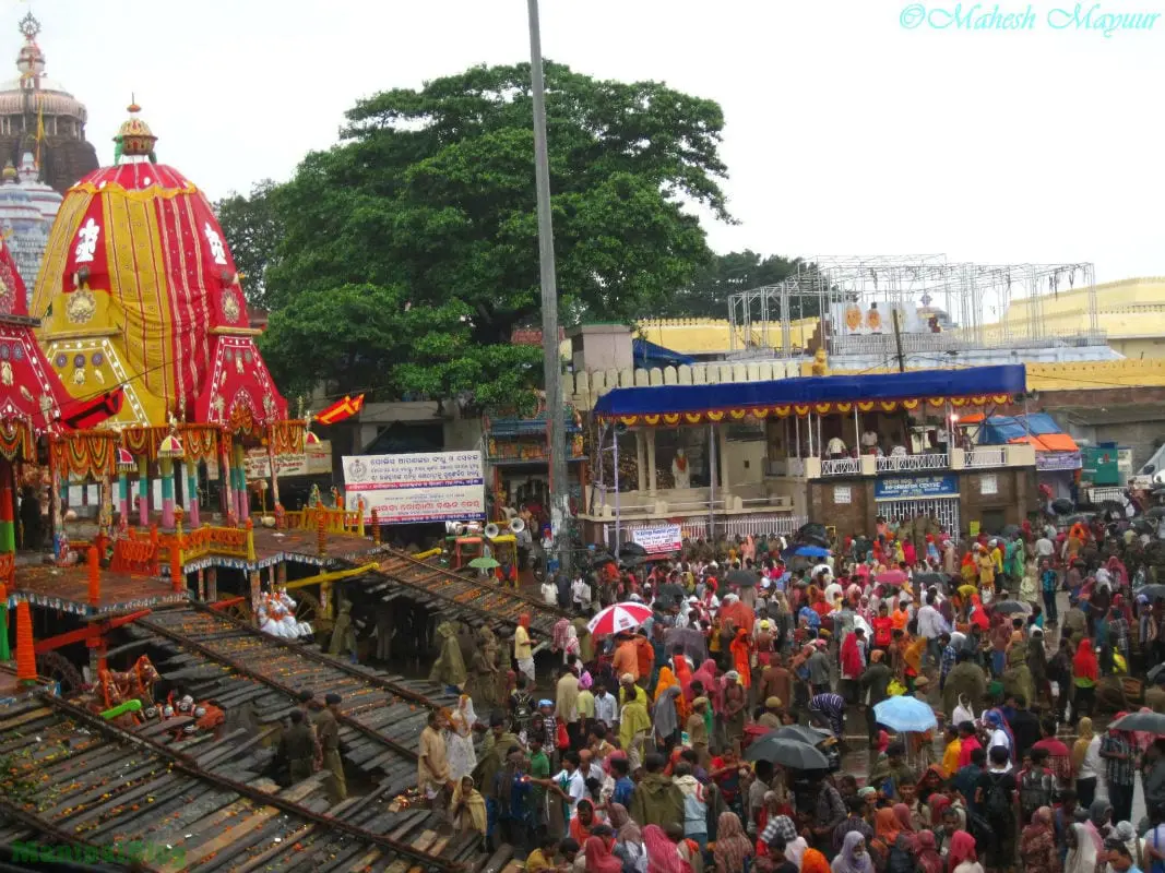 Alittle drizzling makes the weather pleasant before the rath yatra at 6 in the morning. Generally in any procession of dieties associated with a temple, the statues utilised are specially made for such processions and are called Utsava Murtis. But, in Jagannath Puri Car festival, the actual statues of dieties from the the sanctum-sanctorum of the temple are used in the procession.