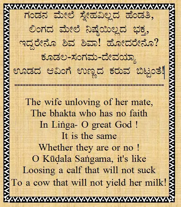 Basavanna was a great devotee of God Kudalasangama, so much, so that he acknowledged no one as his master, though he worked as a treasurer for King Bijjala. Basavannas’ vachanas are sophisticated expressions of a wide range of spiritual experiences, wrestling with fickleness and weaknesses of his own mind.