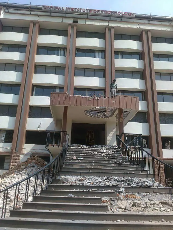 The building was simply standing in the way of the thunderstorm. This is what happens when an unstoppable force meets an immovable object.However, the most severe damage occurred to the more than 50 year old front facade of Manipal Institute of Technology building, which saw a lightning strike destroying its look. The building now resembles something straight out of an end-of-the-world-apocalyptic movie.