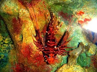 The fish camouflaging the rocks Lion fish in an aquarium