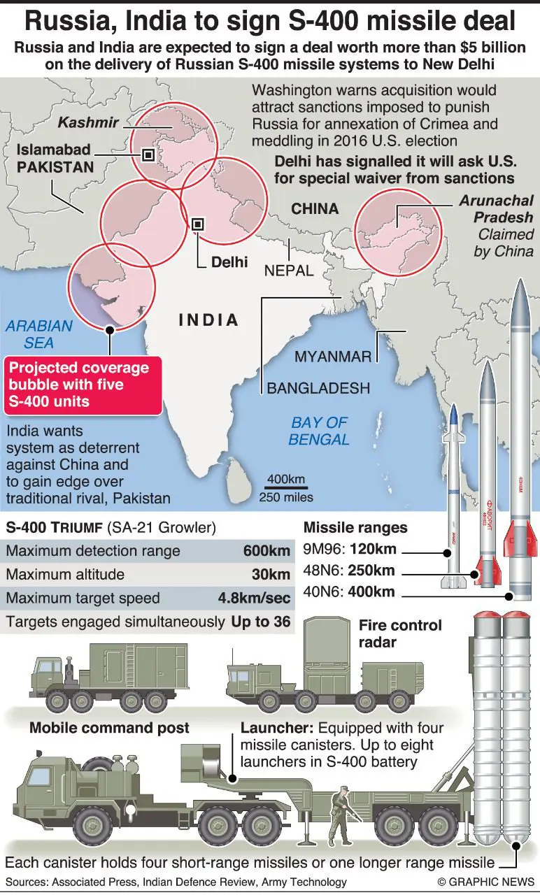 Since China is not a part of the MTCR (Missile Technology Control Regime) it can’t procure the 400 Km missile from Russia. Here India has an edge over China. India will get 5 battalions of the S-400 system. Each battalion will have 8 launchers, various radars, and a command-and-control center. India will get 40 launchers and will be able to launch 160 missiles at any given point in time. India plans to deploy 2 battalions against Pakistan (LOC) and the remaining 3 along the border with China (LAC).