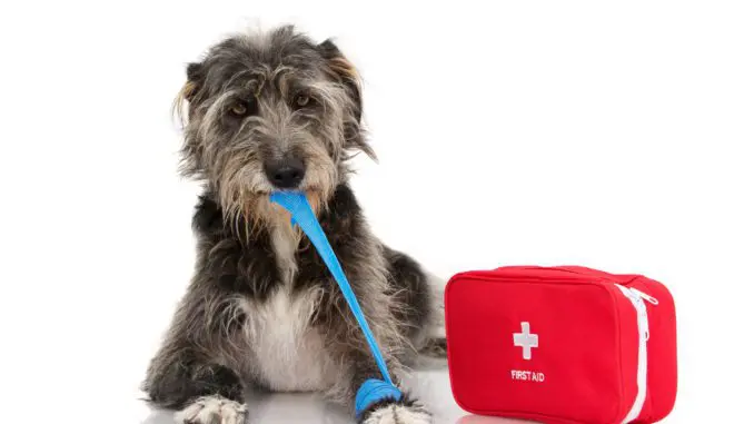 SICK DOG. INJURED AND FUNNY BLACK PUPPY LYING DOWN BITTING AND REMOVING A BLUE BANDAGE OR ELASTIC BAND ON FOOT AND A EMERGENCY OR FIRT AID KIT.